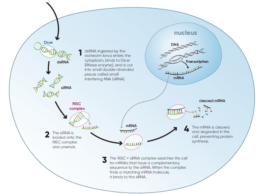 Gene Silencing: The dsRNA is cleaved into siRNAs, which are then loaded onto the RISC. The RISC then targets Snf7 mRNA molecules, binds to them, and cuts them up; effectively silencing the gene by preventing the mRNA from being translated into a protein. Since the corn rootworm needs this protein to survive, deprivation eventually leads to larval death.