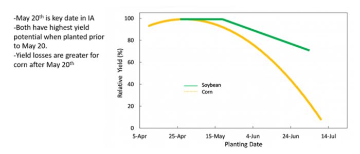 Yield potential response to planting date for corn and soybeans in Iowa